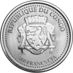 The obverse of the coin bears the Republic of Congo crest, with the monetary denomination of 5,000 Francs CFA below.